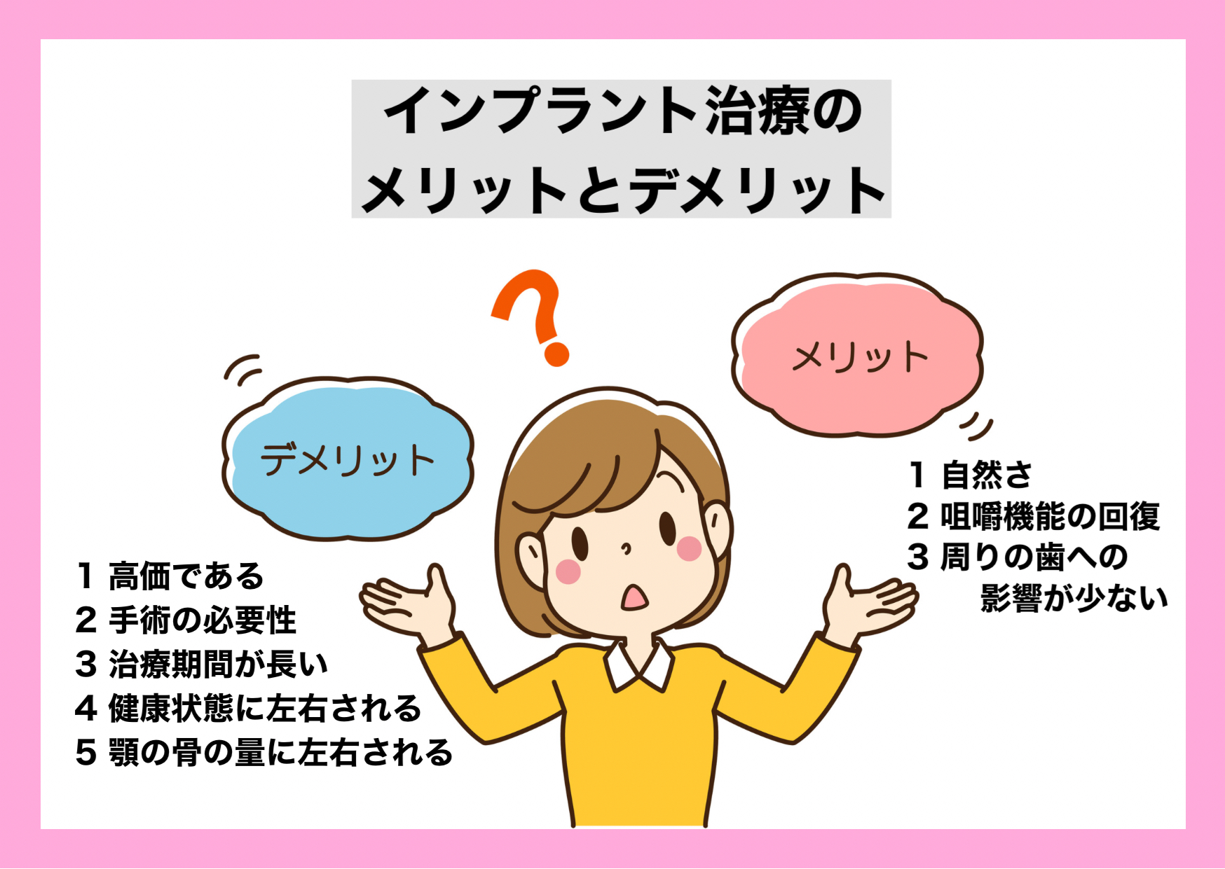 そのインプラント治療のメリットとデメリットについて説明させていただきますね。